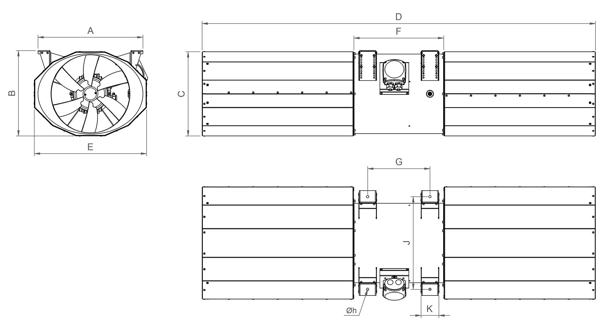 Asynchroniczny silnik elektryczny 3~400V, 50Hz. Skrzynka elektryczna zamontowana na obudowie wentylatora.