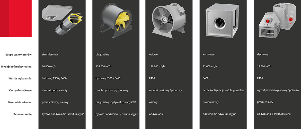 Szeroka oferta wentylatorów wysokotemperaturowych pozwala na kompleksowe podejście do projektowania skutecznej wentylacji oddymiania. Dostępne są różne warianty umożliwiające precyzyjny dobór urządzeń pod kątem funkcjonalności i przeznaczenia: