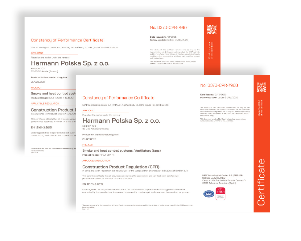 Współpraca z notyfikowanymi jednostkami certyfikującymi zapewnia najwyższy standard jakości i pełną zgodność rozwiązań wentylacyjnych z obowiązującymi przepisami. Wszystkie wentylatory przeznaczone do pracy w systemach oddymiania posiadają certyfikat EN 12101-3 w odpowiedniej klasie temperaturowej.